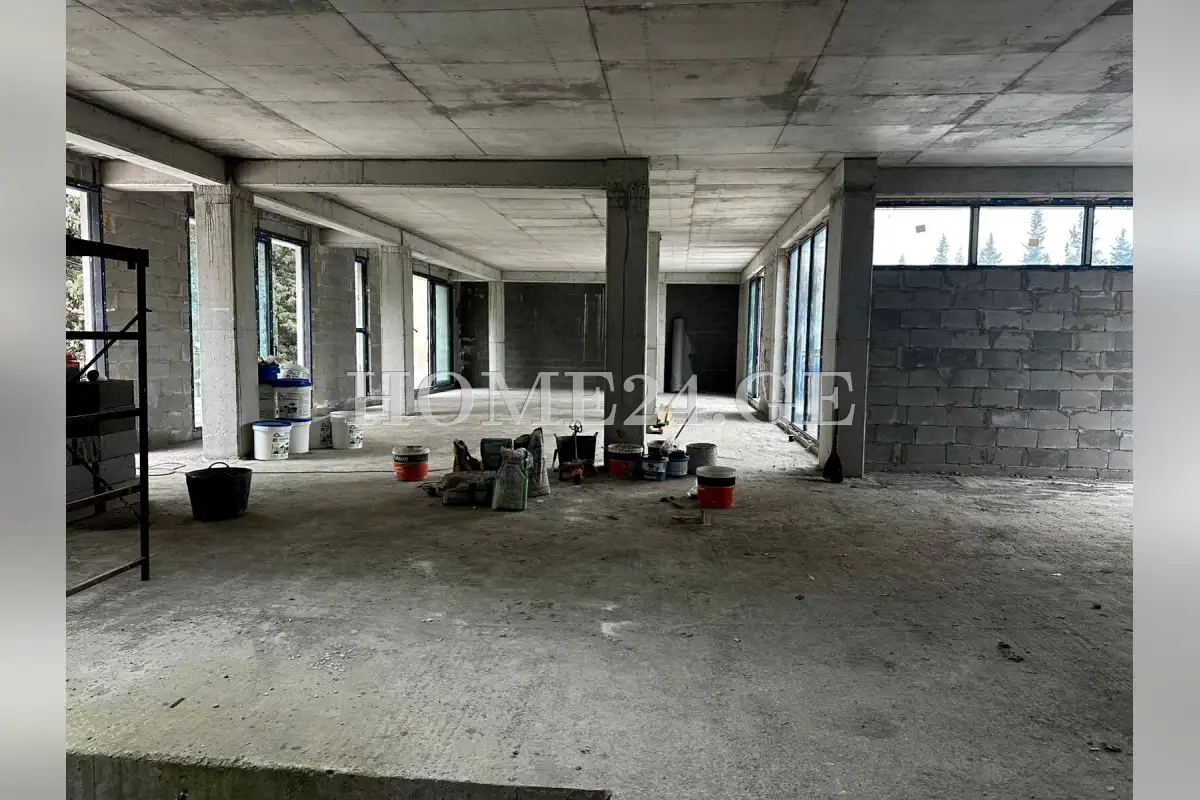 გაშლილი ოთახები დიდი ვიტრაჟებით ხედით ნაძვნარში.